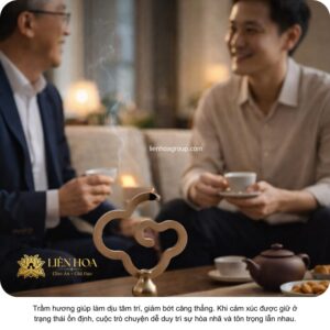 Giao tiếp, đặc biệt là trong tiếp khách, luôn đi kèm nhiều trạng thái cảm xúc khác nhau. Trầm hương giúp làm dịu tâm trí, giảm bớt căng thẳng và hạn chế những phản ứng vội vàng trong lời nói. Khi cảm xúc được giữ ở trạng thái ổn định, cuộc trò chuyện dễ duy trì sự hòa nhã và tôn trọng lẫn nhau. Đây cũng là lý do trầm thường xuất hiện trong những không gian cần sự điềm tĩnh và đồng thuận.