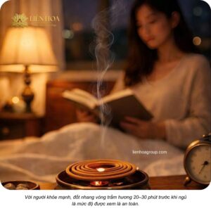 Khoảng thời gian an toàn được khuyến nghị là 20–30 phút trước khi đi ngủ. Sau khi hương trầm lan tỏa đều, bạn nên tắt nhang hoàn toàn để phòng ngủ không còn khói trong lúc ngủ sâu. Cách này vừa tận hưởng được mùi trầm, vừa đảm bảo sức khỏe.