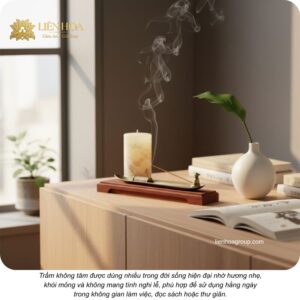 Một trong những lý do khiến trầm không tăm được dùng hằng ngày là vì nó phù hợp với không gian nhỏ. Khói mỏng, hương lan chậm, không bám mùi lâu khiến trầm không gây bí bách cho căn hộ chung cư hay phòng làm việc kín.