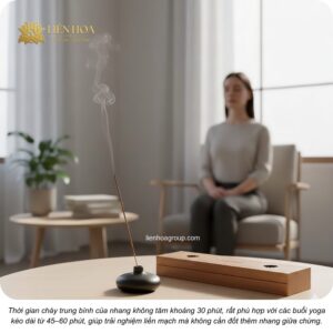Ở các giai đoạn thiền định hoặc tư thế nghỉ sâu (Savasana), hương trầm đóng vai trò như một “điểm neo” cho tâm trí. Khi chú ý vào mùi hương, người tập dễ duy trì sự tỉnh thức, tránh xao nhãng bởi suy nghĩ bên ngoài. Thời gian cháy trung bình của nhang không tăm khoảng 30 phút, rất phù hợp với các buổi yoga kéo dài từ 45–60 phút, giúp trải nghiệm liền mạch mà không cần đốt thêm nhang giữa chừng.