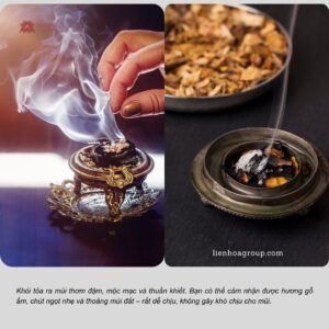 • Trầm hương tự nhiên: Khói mảnh, nhẹ, tỏa ra mùi thơm đậm nhưng không gắt. Bạn sẽ cảm nhận được hương gỗ ấm, chút ngọt dịu và thoảng mùi đất – rất mộc mạc, dễ chịu, càng ngửi càng thấy êm.