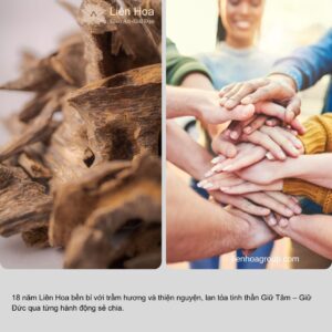 Suốt hành trình 18 năm, Liên Hoa không chỉ tập trung phát triển trầm hương mà còn tích cực tham gia các hoạt động thiện nguyện, tặng quà và hỗ trợ tại Chùa, Tu viện và các tổ chức địa phương. Bạn có thể thấy tinh thần sẻ chia ấy hiện diện xuyên suốt từng giai đoạn phát triển của thương hiệu.