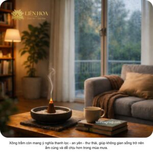 Xông trầm còn mang ý nghĩa thanh lọc – an yên – thư thái, giúp không gian sống trở nên ấm cúng và dễ chịu hơn trong mùa mưa.
