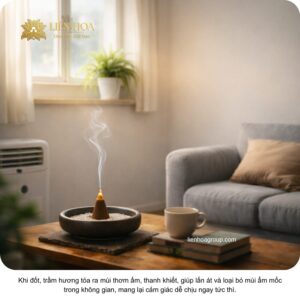 Không chỉ che mùi, trầm hương còn giúp cân bằng không khí, hạn chế mùi ẩm quay trở lại.