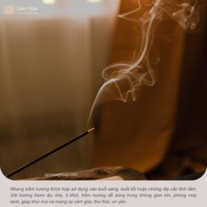 Nhang trầm hương thường được đốt vào buổi sáng sớm hoặc buổi tối, đặc biệt trong các dịp lễ, Tết, giỗ chạp, khai trương hay những lúc cần tĩnh tâm, cầu nguyện. Hương trầm lan nhẹ giúp không gian trở nên trang nghiêm, an yên và hỗ trợ tinh thần lắng lại.