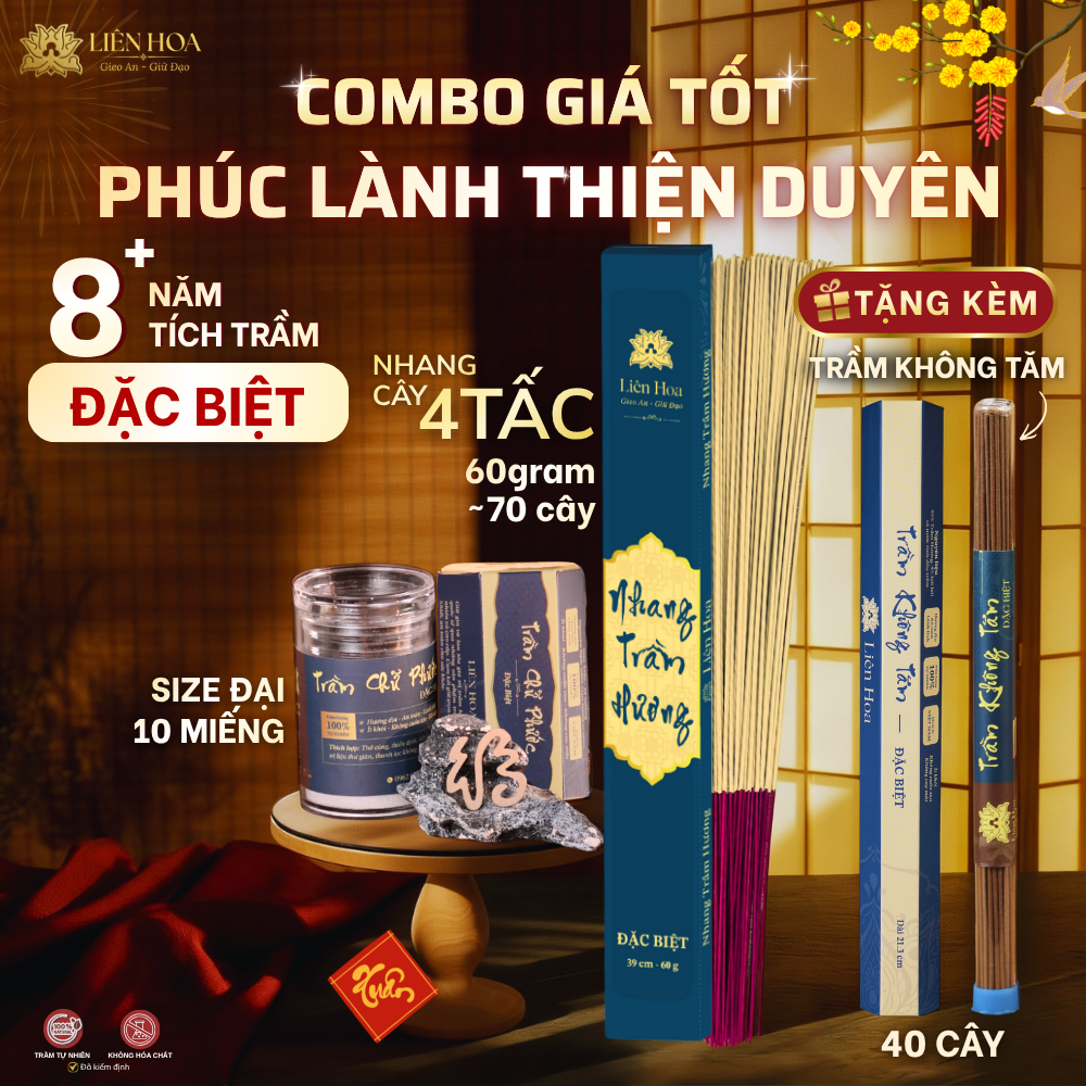 Combo Đặc Biệt – PHÚC LÀNH THIỆN DUYÊN – Trầm Hương Liên Hoa – Nhang Cây và Trầm Chữ Phước + TẶNG KÈM Trầm Không Tăm