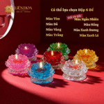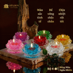 Sản phẩm được chế tác từ lưu ly cao cấp, sắc màu trong trẻo, ánh nến phản chiếu nhẹ nhàng, tạo cảm giác ấm áp và trang nghiêm.