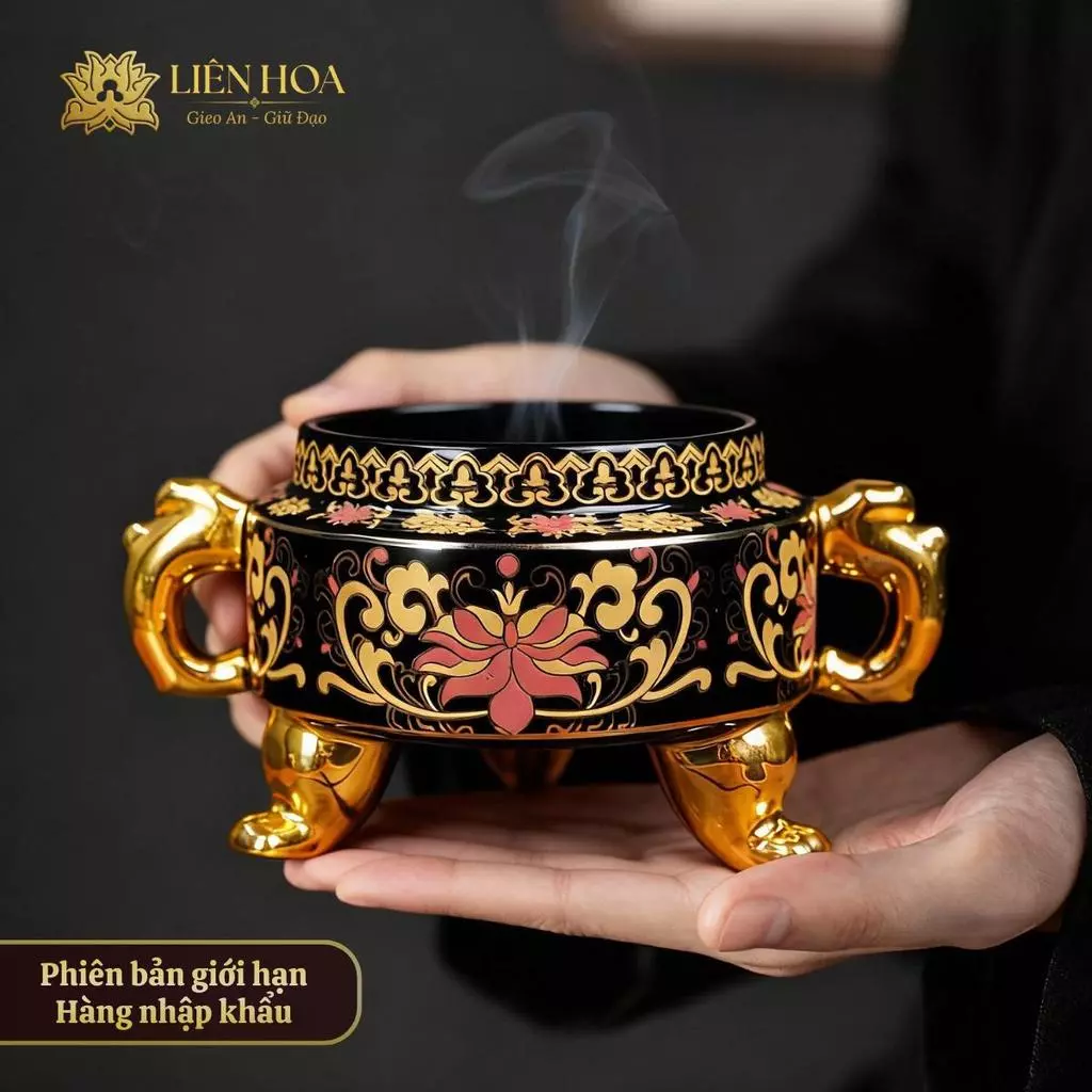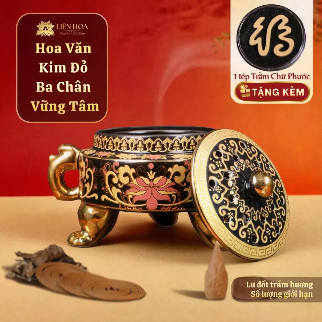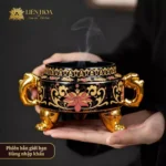 - Tên sản phẩm: Lư Xông Trầm 3 Chân Hoa Văn Kim Vàng Cao Cấp Liên Hoa