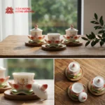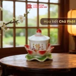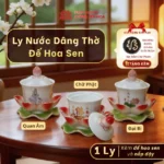 Cả 3 phân loại có thiết kế, kích thước và công năng giống nhau, chỉ khác họa tiết trên thân ly. Sản phẩm gồm ly có nắp và đế hoa sen, làm từ gốm sứ tráng men, đặt gọn gàng và trang nhã trên bàn thờ. Ly có nắp giúp giữ nước sạch, đế sen tạo bố cục cân đối, dễ sắp xếp cùng các vật phẩm thờ khác.