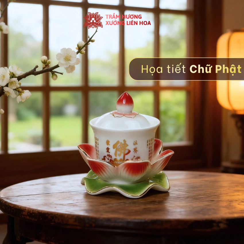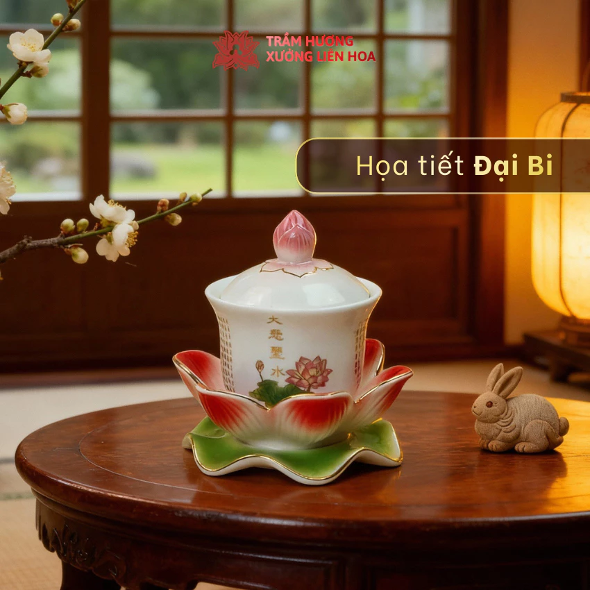 Ly Nước Cúng Có Nắp Kèm Đế Hoa Sen Bằng Sứ Cao Cấp Hình Quan Âm, Đại Bi,Chữ Phật Đựng Nước Thờ Cúng