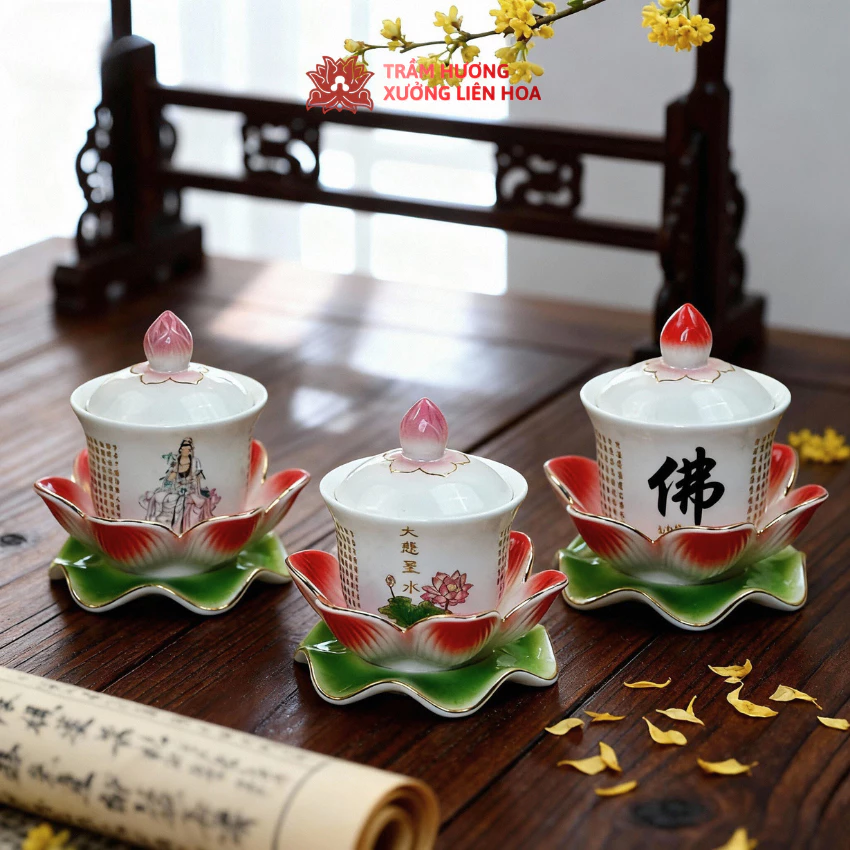 Ly Nước Cúng Có Nắp Kèm Đế Hoa Sen Bằng Sứ Cao Cấp Hình Quan Âm, Đại Bi,Chữ Phật Đựng Nước Thờ Cúng là vật phẩm dùng để đựng nước thờ trên bàn thờ. Sản phẩm gồm ly có nắp kèm đế hoa sen, thiết kế đồng bộ, đặt gọn gàng và trang nhã trong không gian thờ cúng. Ly được làm từ sứ tráng men, tạo hình hoa sen nhiều lớp cánh, phù hợp sử dụng thờ nước hằng ngày hoặc các dịp lễ.