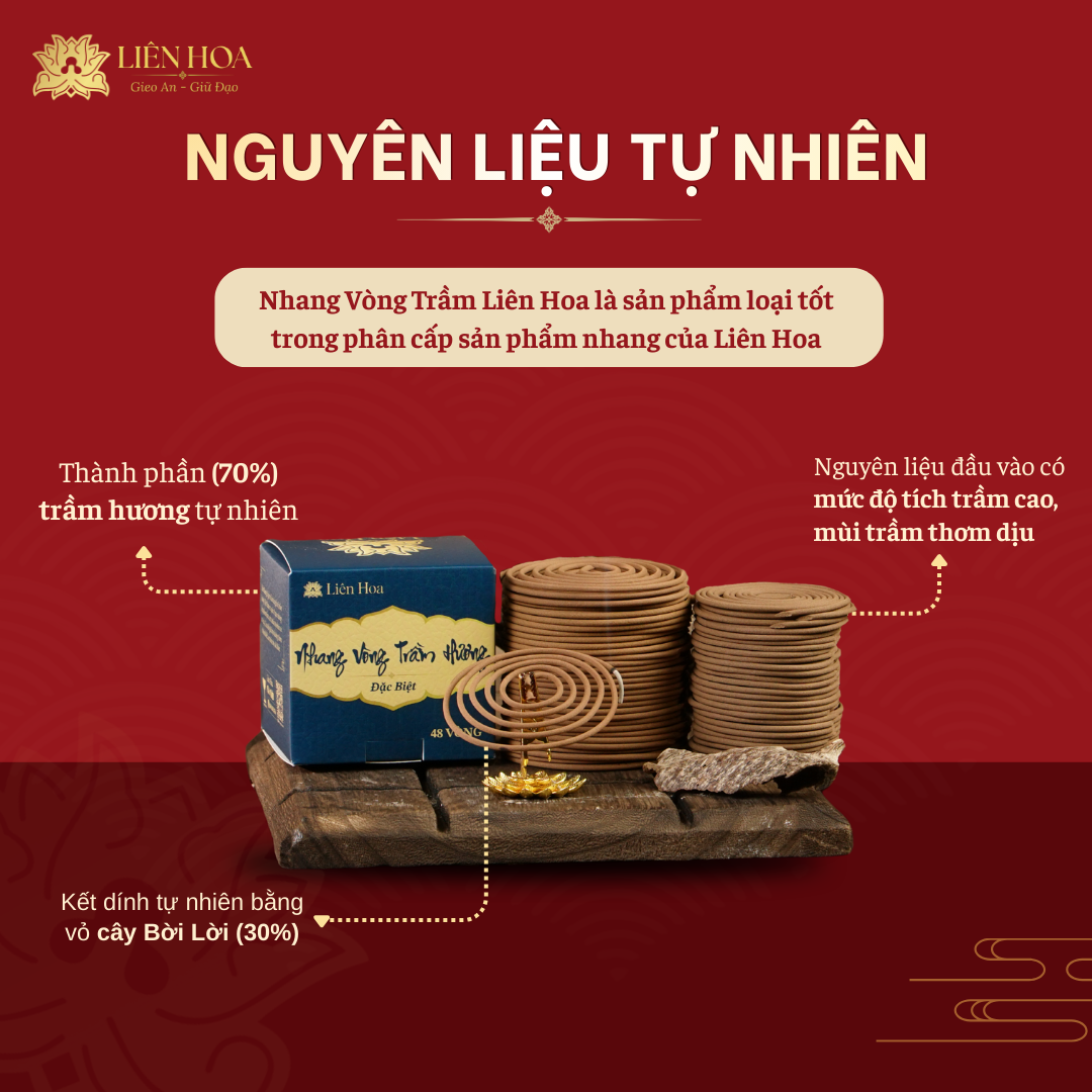 Nhang vòng Trầm Hương Liên Hoa được chế tác từ bột trầm nguyên chất, rây mịn nhiều lần giúp nhang cháy đều và giữ lại tinh dầu tự nhiên. Hương thơm dịu sâu, bền mùi nhưng không nồng gắt. Sản phẩm được ưa chuộng trong nước và xuất khẩu sang Đài Loan, Trung Quốc, Mỹ, Malaysia và Indonesia.