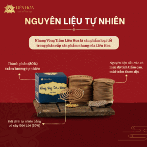 Nhang Vòng Trầm Hương Liên Hoa được làm từ những miếng trầm hương nguyên chất, trải qua quá trình tách lớp tinh tế và rây bột nhiều lần để tạo nên thành phẩm hoàn hảo. Sản phẩm sử dụng nước tinh dầu trầm quý để phối trộn thay cho nước thường, giúp giữ trọn vẹn tinh dầu tự nhiên, mang đến hương thơm sâu, bền và thuần khiết.