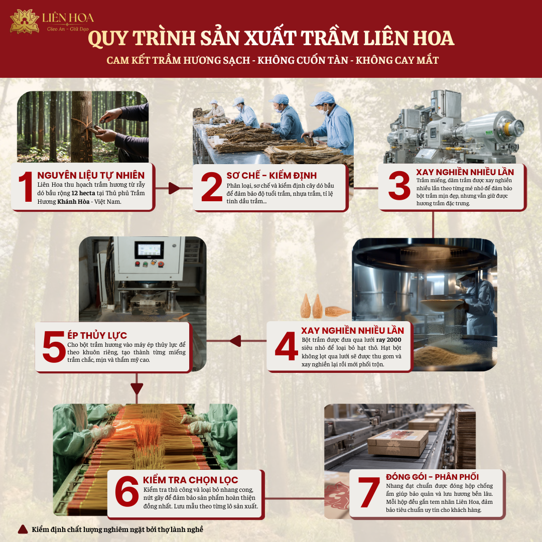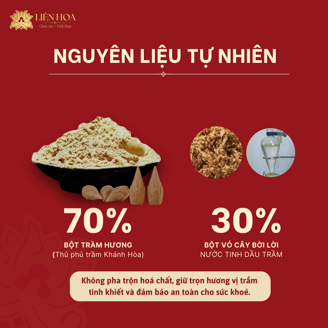- 70% trầm hương tự nhiên từ vùng nguyên liệu lâu năm