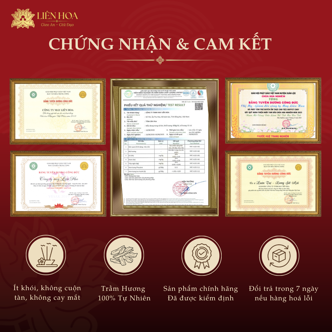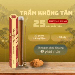 Trầm hương không tăm Thượng Hạng Liên Hoa được tuyển chọn từ trầm tự nhiên hơn 25 năm tuổi, già tinh dầu, cho hương thơm sâu ấm, dày tầng và lưu hương bền lâu. Hương trầm thanh khiết, dịu ngọt, ít khói, không khét, không cay mắt, phù hợp với không gian trang nghiêm và tĩnh tại.