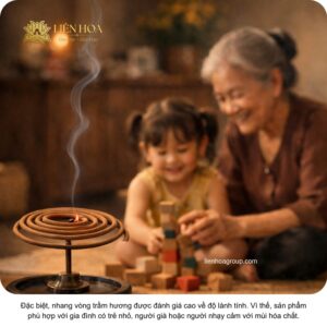 Đặc biệt, nhang vòng trầm hương được đánh giá cao về độ lành tính. Vì thế, sản phẩm phù hợp với gia đình có trẻ nhỏ hoặc người nhạy cảm với mùi hóa chất.