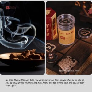 Bạn có từng tò mò điều gì tạo nên hương trầm nhẹ và sâu của nụ Trầm Vân Mây? Sản phẩm được Liên Hoa chế tác từ bột trầm hương nguyên chất, tuyển chọn từ phần lõi già giàu tinh dầu của cây dó bầu. Thông qua quá trình ép thủy lực tinh tế, nụ trầm được tạo hình như những đám mây nhỏ, mang ý nghĩa thanh cao, an nhiên và thư thái.